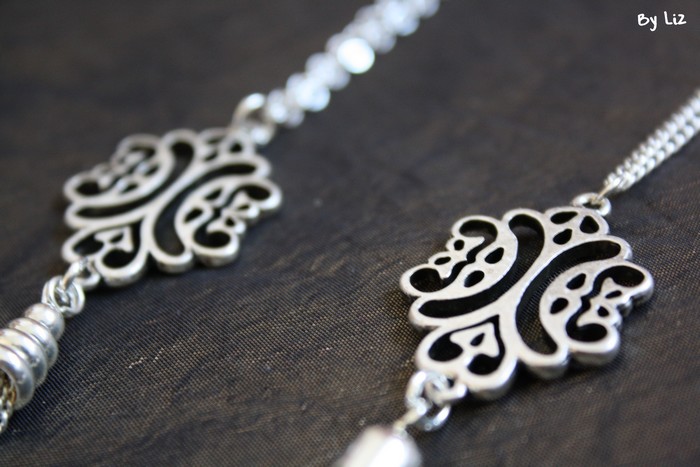 J’avais donc déniché un collier avec de jolies breloques en arabesques... un sautoir en chaînette argentée, 5 arabesques et des petites swarovski… Je trouvais les pièces très jolies mais mal réparties et du coup, assez mal mises en valeur, cela ne me donnait pas envie de le porter…