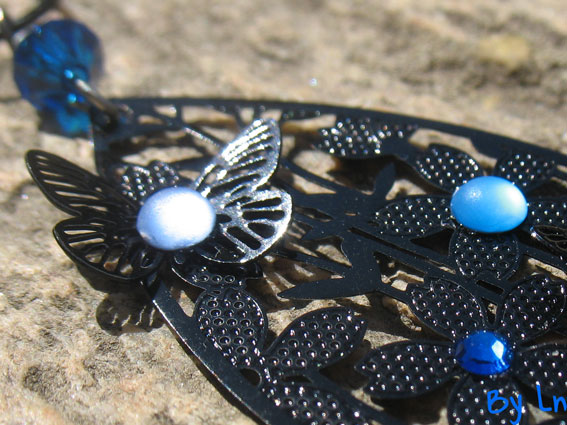 Le résultat : une paire de boucles d’oreilles pendantes, légères et aériennes : un support travaillé en finesse (ce ne fut pas facile… !), des papillons pour un peu de poésie, des strass et une toupie pour apporter de la couleur.