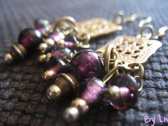 Pour les boucles d’oreilles, je suis partie d’une plaque d’écartement décorative en métal. J’y ai juste suspendu plusieurs perles violettes.