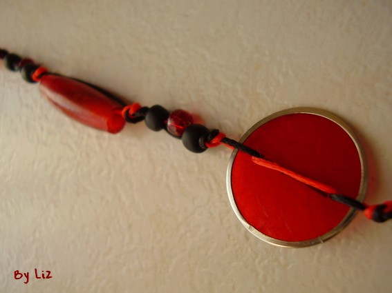Tout d’abord voici un collier réalisé avec du matériel La Droguerie… De jolies pastilles rouge et argentées, des perles en bois et du fil coton… Il date de 2008 (ouhhhh je suis graaave en retard) et je ne sais même pas pourquoi je ne vous l’avais jamais montré car je le trouve vraiment joli (oui, oui je m’envoie des fleurs aujourd’hui…)… Malgré le choix du matériel et des perles qui pourrait donner un côté très ethnique, je le trouve fin et délicat…