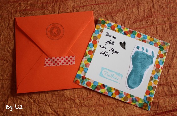Voici donc le résultat… Une petite carte toute simple format carré, du masking-tape, une empreinte de pied, et un petit mot « spécial Papa« …