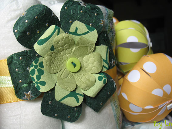 Des rubans, des fleurs en papier, une guirlande en papier, une enveloppe avec un petit mot, des petits papillons verts pour décorer le tout.